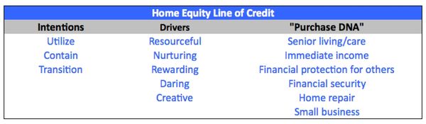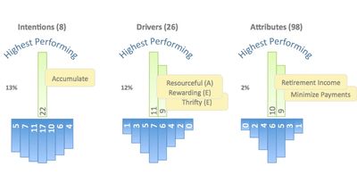In this simple example, consider a Home Equity Line of Credit. Ask a friend, even a professional banker, to guess the number of reasons someone might want this product. Do a handful seem reasonable? Maybe a dozen? Think again. The attached chart shows 3 intentions, 5 potential psychographic drivers, and 6 deterministic attributes. Go from website to website, and find the same handful of marketing catch phrases. Yet, mathematically, the nuances equal 16,383!