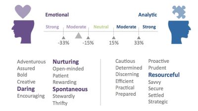 In the example shown, the potential customer (who we'll name Justine) plots Moderately Emotional. Of Jasmine's statistically recurring drivers, the emotional Daring, Nurturing & Spontaneous outweigh her lone analytical driver, which is Resourceful. While Jasmine tends to be less analytical when framing her purchase goals, messaging should reflect her placement on the spectrum. To ignore her score of Moderately Emotional (vs Strongly Emotional) would do her disservice, and would lessen her commitment to buy.